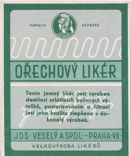 Ořechový likér - 11 x 9 cm, Josef Veselý a spol. Praha VII |