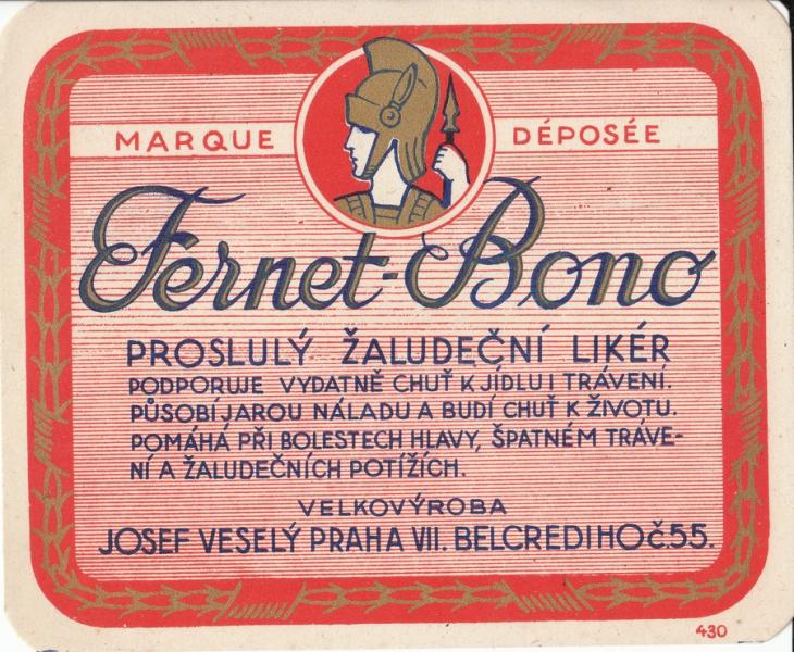 Fernet - Bono - 12,5 x 10 cm, Josef Veselý a spol. Praha VII |