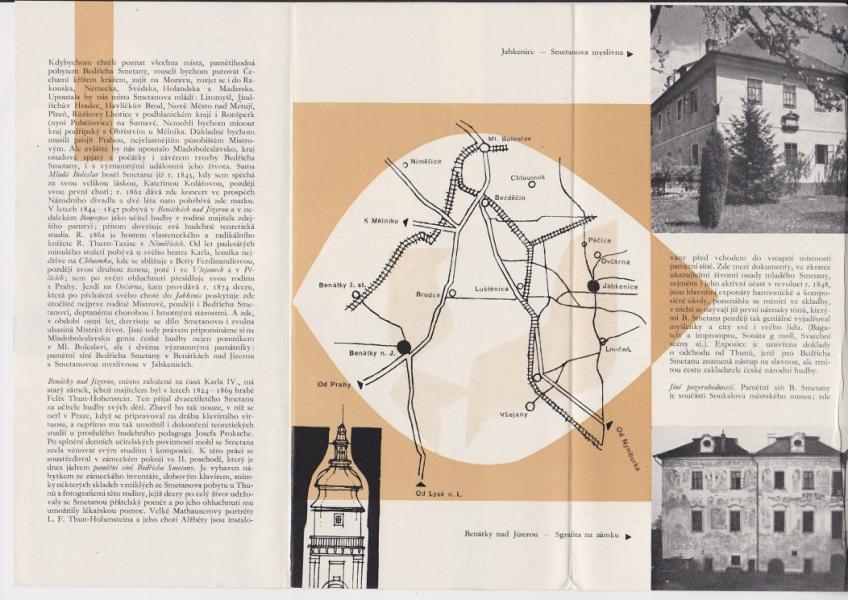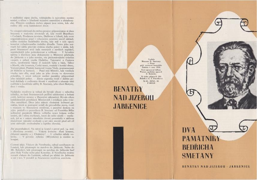 Brožura Památníky Bedř. Smetany - Benátky n. Jizerou, Jabkenice - Rozměry 20,5 x 10 cm, rozkládací, 3 stránky textu, plno fotografií. |
