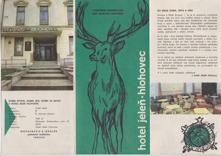 Brožura Hotel Jeleň, Hlohovec - Harmonikové skládání, na délku formát A4 (o něco delší). |